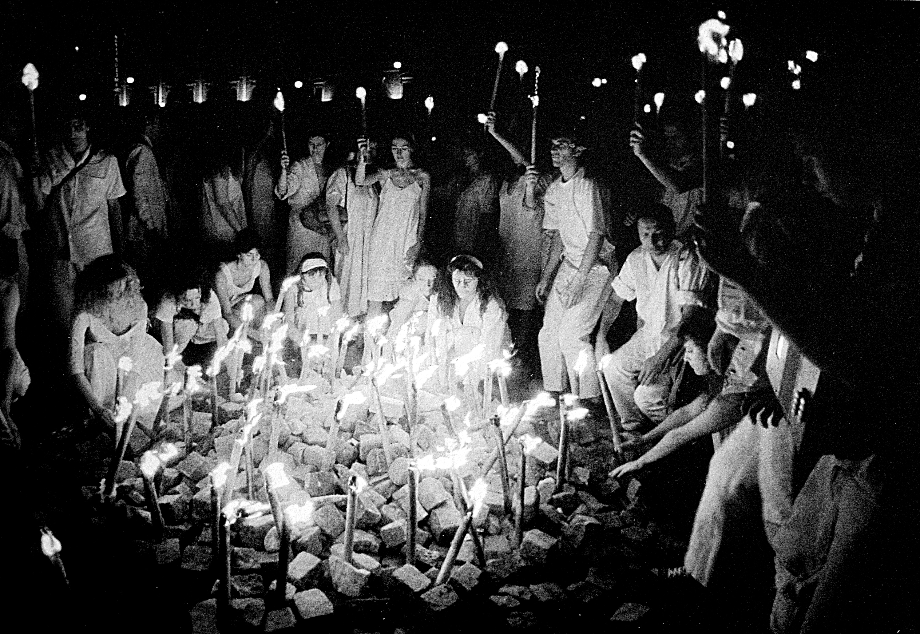 Concluso l’atto nelle dieci piazzette, i giovani attori confluirono in piazza Maggiore per l’atto corale: ad aspettarli e ad accompagnarli c’erano migliaia di persone: venticinquemila, trentamila. Il gesto finale prevedeva che ognuno dei cento attori raccogliesse una pietra, avviandosi a piedi verso la stazione cantando una ninna nanna popolare. Ed è a questo punto che si sconfinò dallo spettacolo nel rito. Gli attori offrivano una pietra a chi del pubblico volesse prenderla per unirsi a quella processione verso la stazione. Molti, moltissimi, la presero e si unirono.